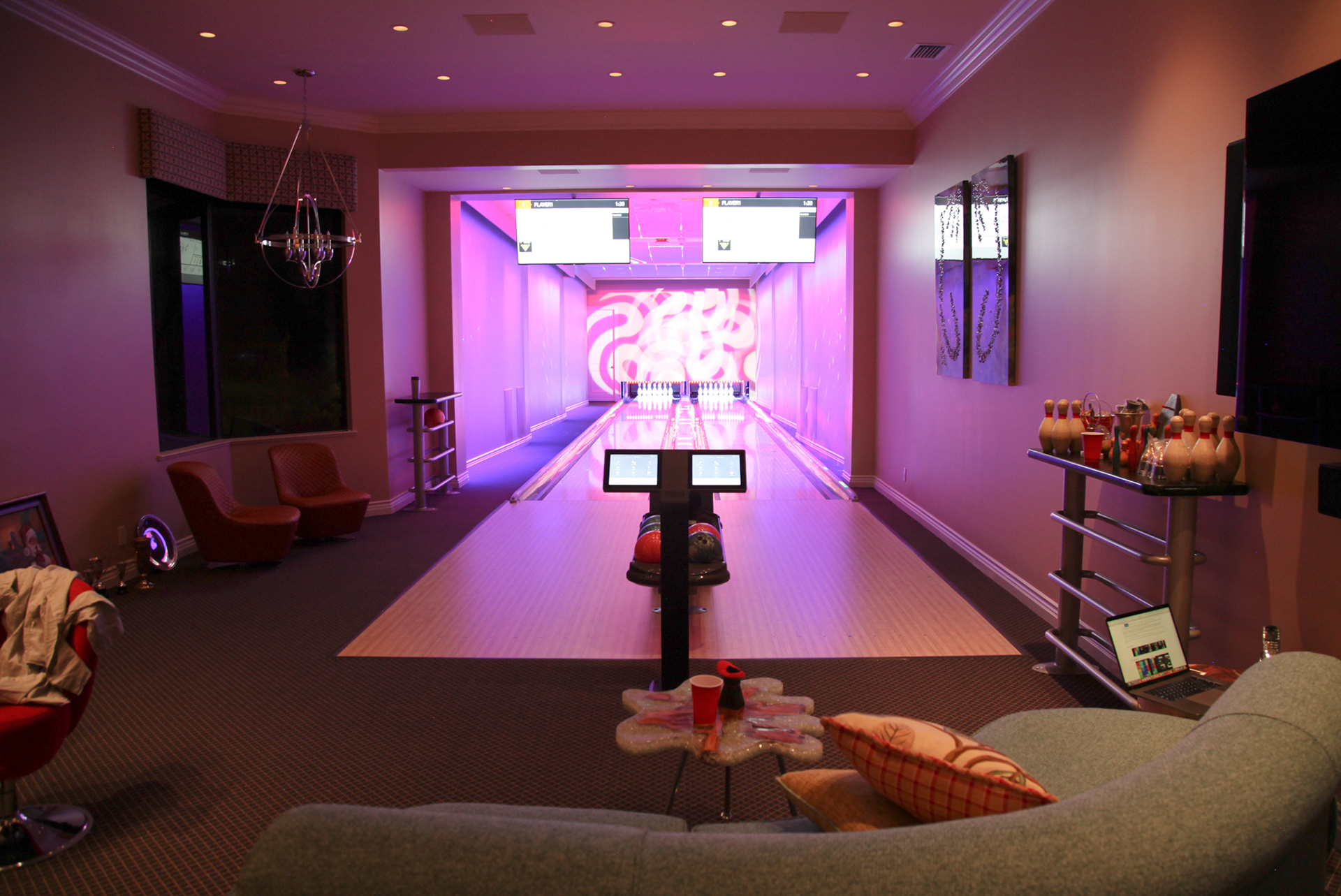 Simply rolling the ball can affect the images projected on the lane and depending on the scene, it can affect the entire room. The client entertains distinguished guests and diplomats throughout the year and wanted the ability to showcase branded content on the walls, lanes. Multiple scenes that are fun and tasteful with the ability to customize environments.