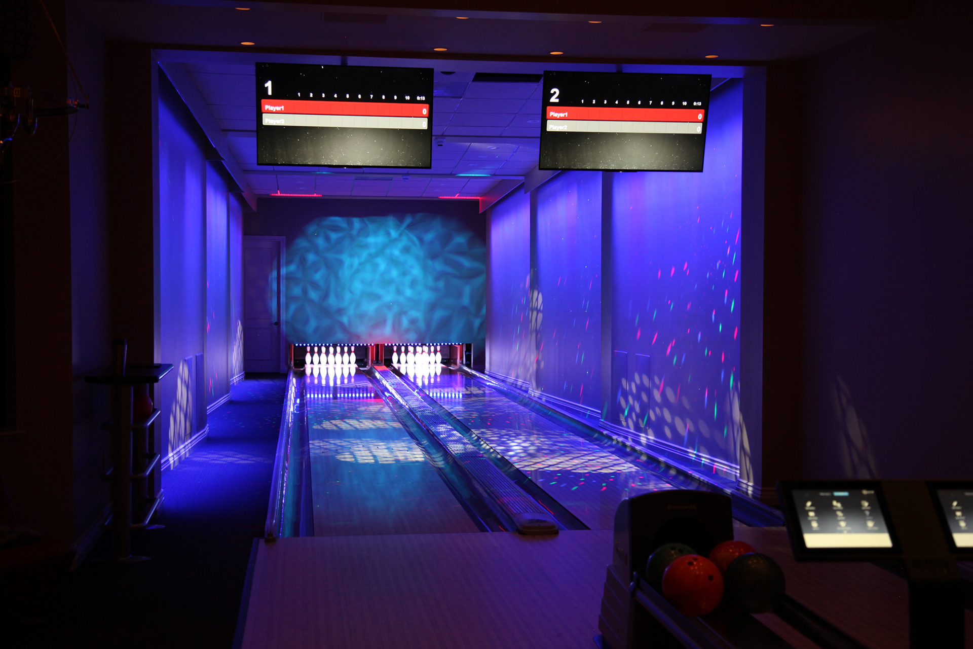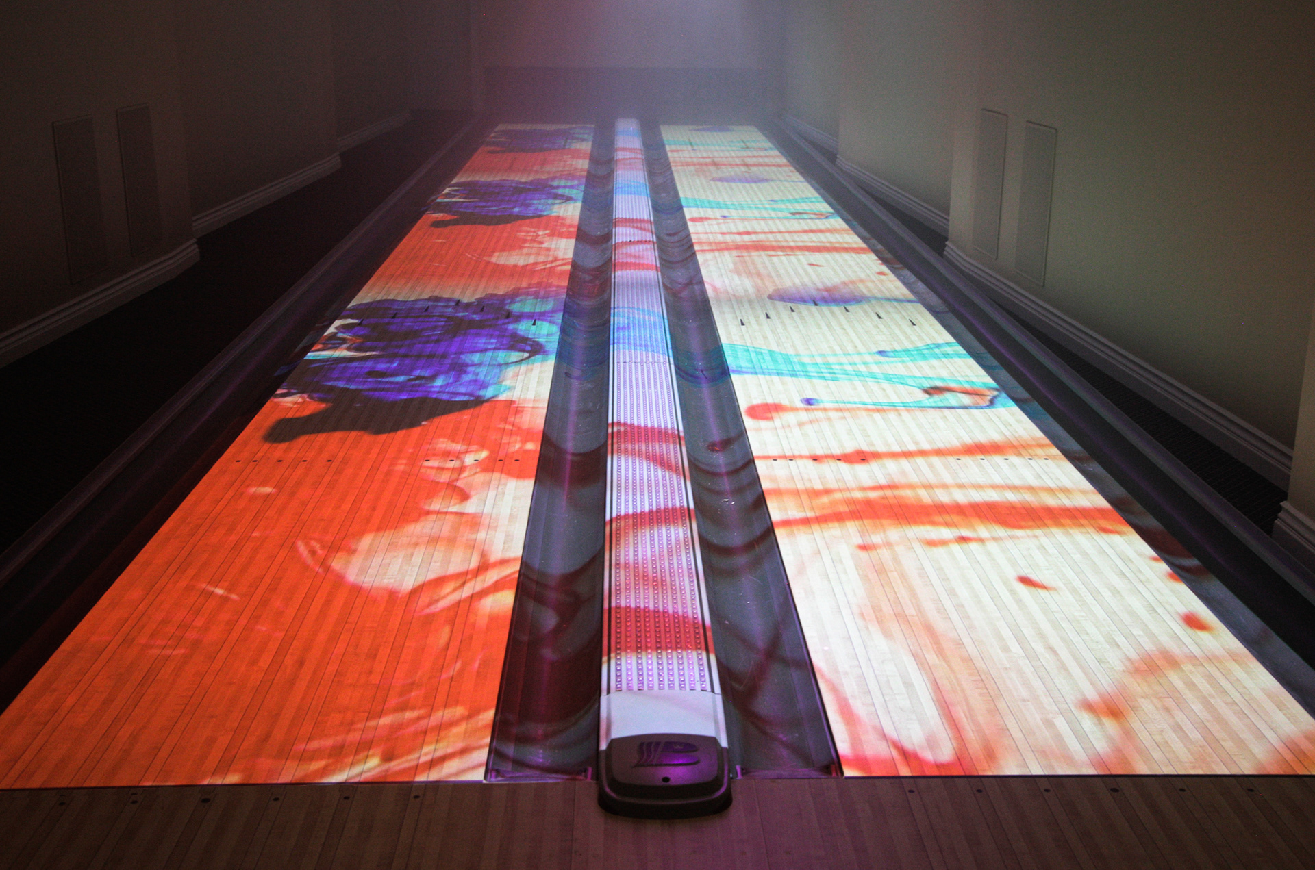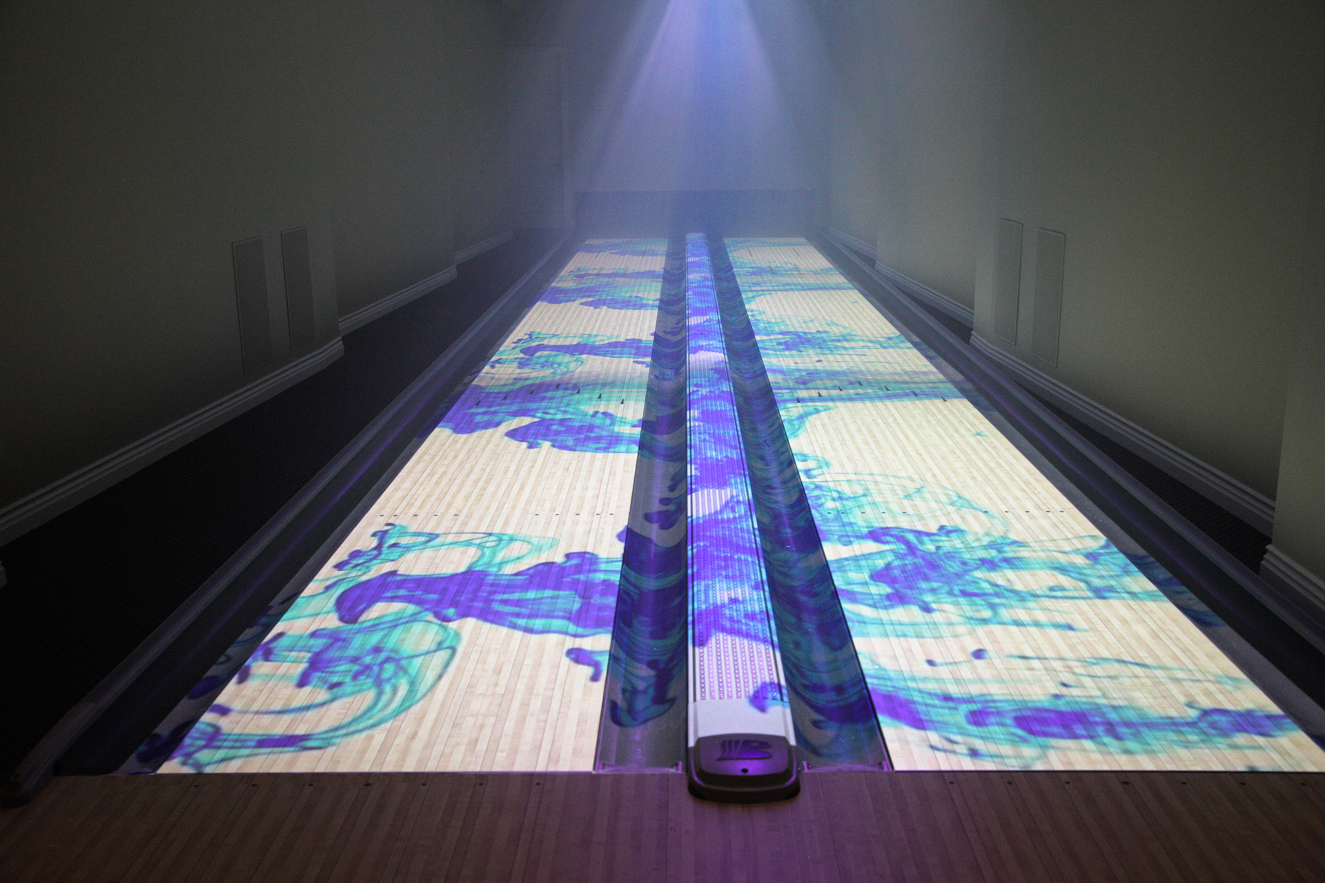 An armada of controlled concert lights were installed in the floor, walls, and ceiling to wash and transform the 3,000sf space. In order to projection map the bowling lanes, custom scaffolding was created to securely mount 3 Sony 6,000lm laser projectors in the ceiling. With accompanying cameras and TouchMagix interactive display software, game events can trigger graphics for downed pins, bowler performance, and gaming outcomes. Cinema4D, HoudiniFX, After Effects, and FCPX were used to edit and deliver additional dynamic imagery. The entire package offers the client the ability to host and brand fundraisers, parties, and family gatherings.
