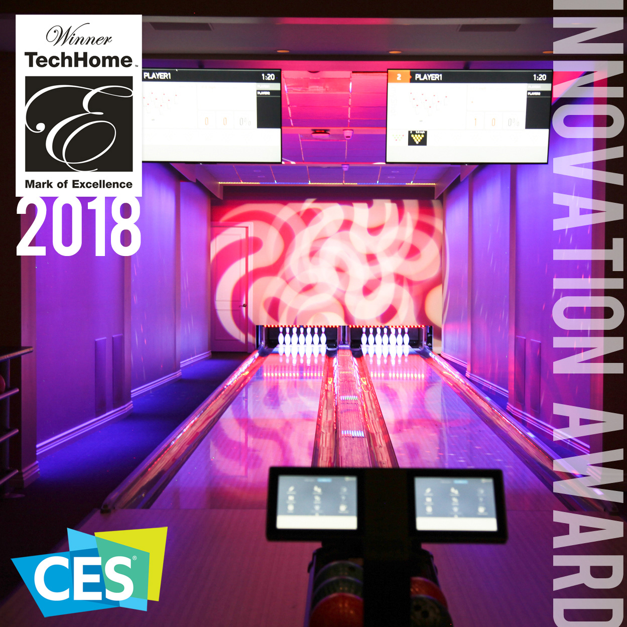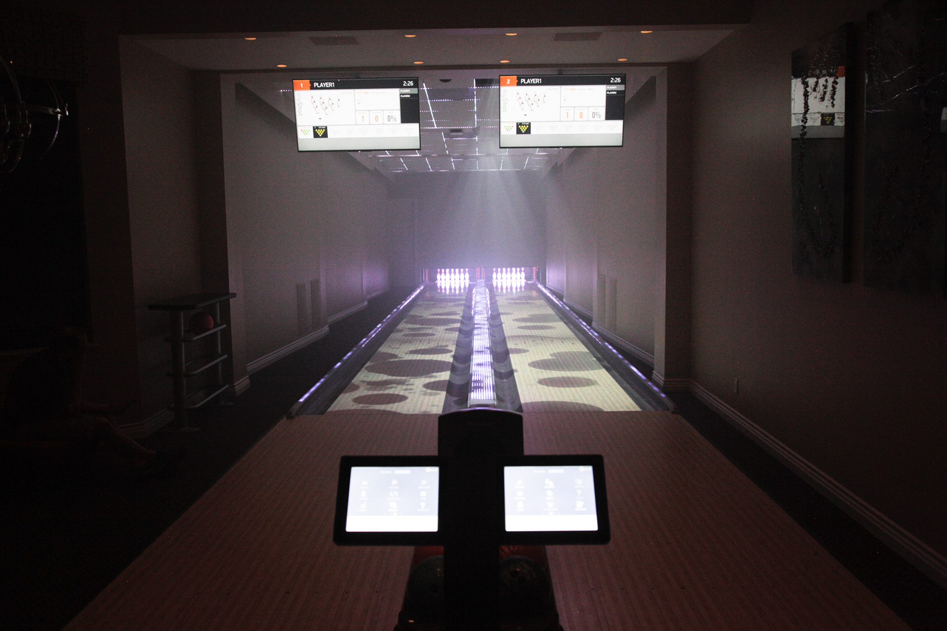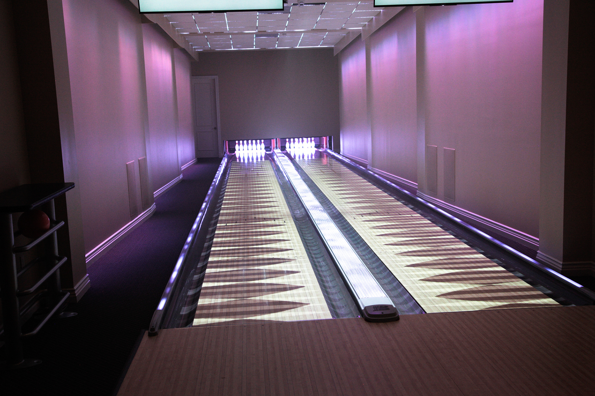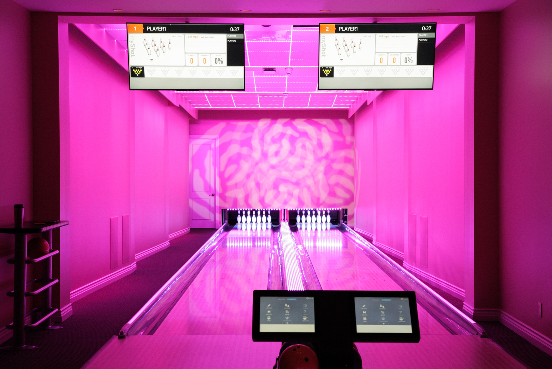 An armada of controlled concert lights were installed in the floor, walls, and ceiling to wash and transform the 3,000sf space. In order to projection map the bowling lanes, custom scaffolding was created to securely mount 3 Sony 6,000lm laser projectors in the ceiling. With accompanying cameras and TouchMagix interactive display software, game events can trigger graphics for downed pins, bowler performance, and gaming outcomes. Cinema4D, HoudiniFX, After Effects, and FCPX were used to edit and deliver additional dynamic imagery. The entire package offers the client the ability to host and brand fundraisers, parties, and family gatherings.
